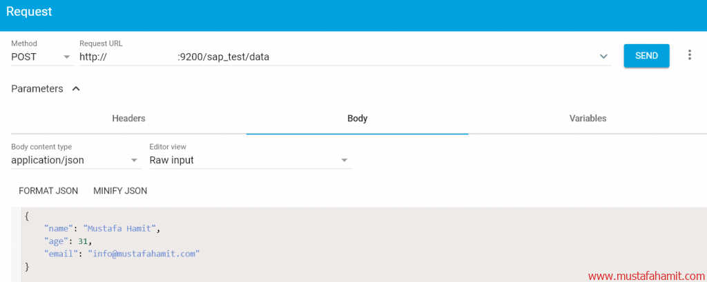 { "took": 0, "timed_out": false, "_shards": { "total": 1, "successful": 1, "skipped": 0, "failed": 0 }, "hits": { "total": { "value": 1, "relation": "eq" }, "max_score": 1.0, "hits": [{ "_index": "sap_test", "_type": "data", "_id": "k_zUtW4BEXympLPHzxyi", "_score": 1.0, "_source": { "name": "Mustafa Hamit", "age": 31, "email": "info@mustafahamit.com" } }] } } |