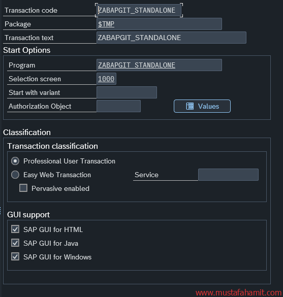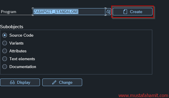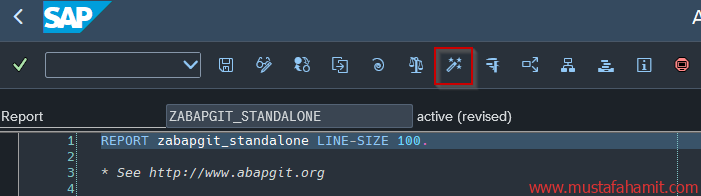 SE38 ekranına girip program adına ZABAPGIT_STANDALONE yazıp create tuşuna basarız. Eğer mevcut bir program varsa, içine girip yukarıdaki linkten güncel sürümü indirip tekrar güncelleyebiliriz.