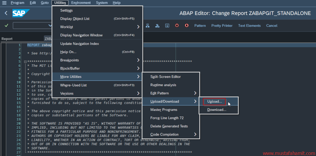 Sonrasında aşağıdaki menüden indirip kaydettiğimiz abap kodunu “Upload” yaparız.