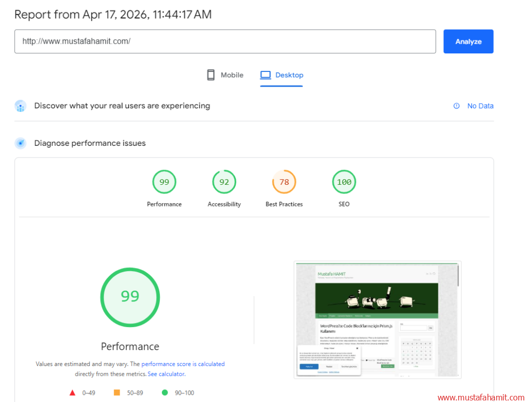 Analiz butonuna bastıktan sonra sonuçları detaylı olarak görebilirsiniz. Üstelik mobile ve desktop versiyonlarını da karşılaştırabilirsiniz.